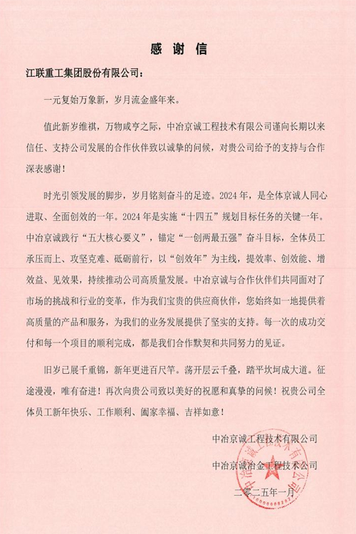 近日,公司收到了來自中冶京誠工程技術有限公司和中冶京誠冶金工程技術公司的聯(lián)名感謝信,對我司在九江鋼鐵超高溫亞臨界煤氣發(fā)電工程項目中的鼎力支持表示了感謝,并對我司在技術實力、項目管理以及質量管控等方面的出色表現(xiàn)給予了高度評價。
